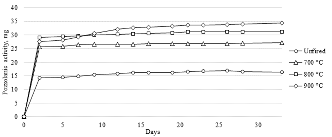 The pozzolanic activity of the fired shale was then determined by the classical lime absorption method [12], [13]. One gram of finely ground shale was placed into 100 mL of saturated lime solution with a CaO concentration of 1.05-1.15 g/L. The mixture was shaken and titrated with 0.05 N HCl every two to three days over 30 days using methyl orange as an indicator. The activity was expressed as the amount of Ca(OH)2 absorbed per gram of additive, which provided a quantitative measure of the reactivity of the fired material.