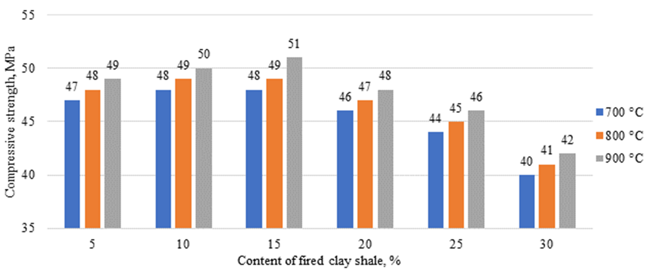 Figure 4 presents the results of compressive strength tests of composite cements with different contents of fired clay shale at 700, 800, and 900 °C.