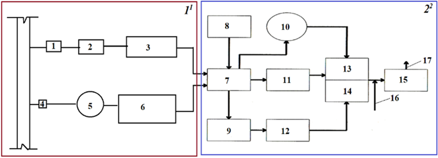Figure 1 – Technological scheme of the MTF [2], [3]: 11 – Water intake structures; 22 – Water treatment facilities; 1 – Ice discharge; 2 – Sand trap; 3 – Daily regulation basin (DRB-1), 4 – Venturi flume; 5 – Radial settling tank; 6 – Daily regulation basin (DRB-2); 7 – Distribution chamber; 8 – Reagent facility; 9 – Drum screens; 10 – Radial settlers with spiral guides; 11 – Vertical settlers; 12 – Horizontal settlers; 13 – Rapid filters (2nd stage); 14 – Rapid filters (3rd stage); 15 – Clear water reservoirs; 16 – Sodium hypochlorite dosing for disinfection; 17 – Water supply to consumers.