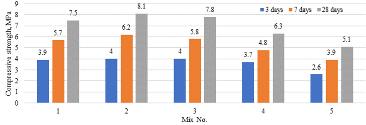 Analysis of the obtained results shows that the highest compressive strength at 28 days is achieved in mix No. 2, reaching 39.1 MPa. Mix No. 5, in turn, demonstrates the lowest strength at all stages: 12.3 MPa at 3 days, 18.2 MPa at 7 days, and 24.5 MPa at 28 days. These data may indicate low reactivity or a suboptimal composition of mix No. 5.
