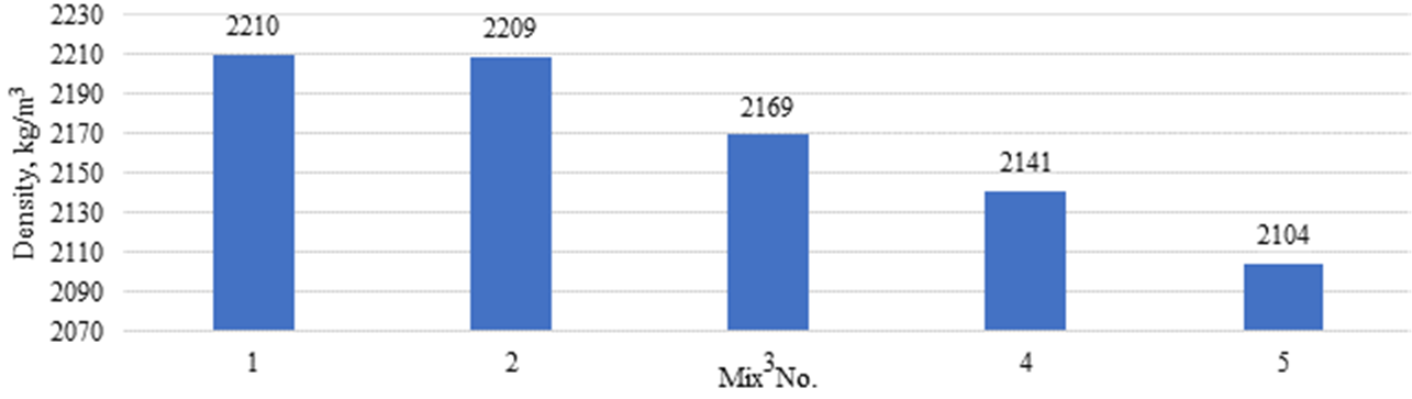 Analysis of the results in Figure 6 shows that mix No. 1 demonstrates the highest density (2220 kg/m³), slightly ahead of mix No. 2 (2210 kg/m³) and mix No. 3 (2209 kg/m³). Mixes No. 4 (2141 kg/m³) and No. 5 (2104 kg/m³) show lower density values, with mix No. 5 having the lowest density among all presented mixes. This indicates that replacing part of the sand with water supply sludge from the MTF results in a decrease in the density of concrete products.