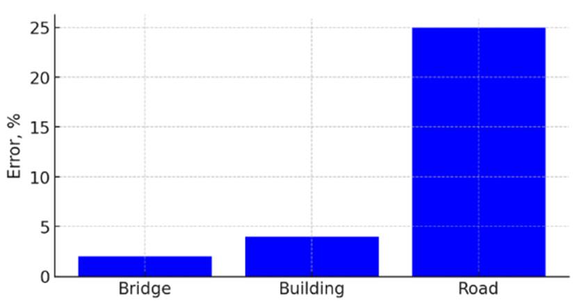 Figure 2 shows a histogram of average errors: bridge - 2%, building - 4%, road - 25%; errors increase monotonically with increasing complexity of the external environment, which confirms the conclusions of [4] about the degradation of accuracy with increasing climatic and operational influences.
