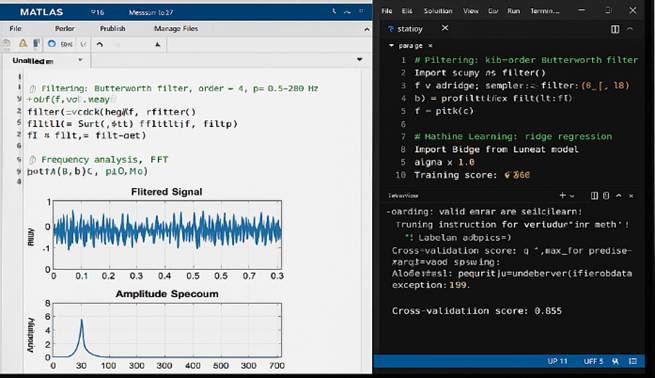 Dual window: MATLAB on the left shows the signal after the Butterworth filter and its FFT, and VS Code on the right shows a Python script with SciPy filtering and scikit-learn ridge regression, confirming that raw data, spectral features, and ML modeling are performed in a single workflow; instant visualization of MATLAB plots shows a “clean” signal in the passband and a dominant low-frequency peak, confirming the correctness of the filter parameters and highlighting the resonance component used further as a feature in the ML model; script automation via the Python console outputs a cross-validation score of ≈ 0.855, showing that the quality of the model is assessed in real time and corresponds to R² ≈ 0.85 from the Results section; The compatibility of the tools is demonstrated by the ability to run MATLAB (commercial) and Python (open-source) on the same PC, which increases reproducibility and allows researchers to repeat DSP steps in any environment and compare the results.