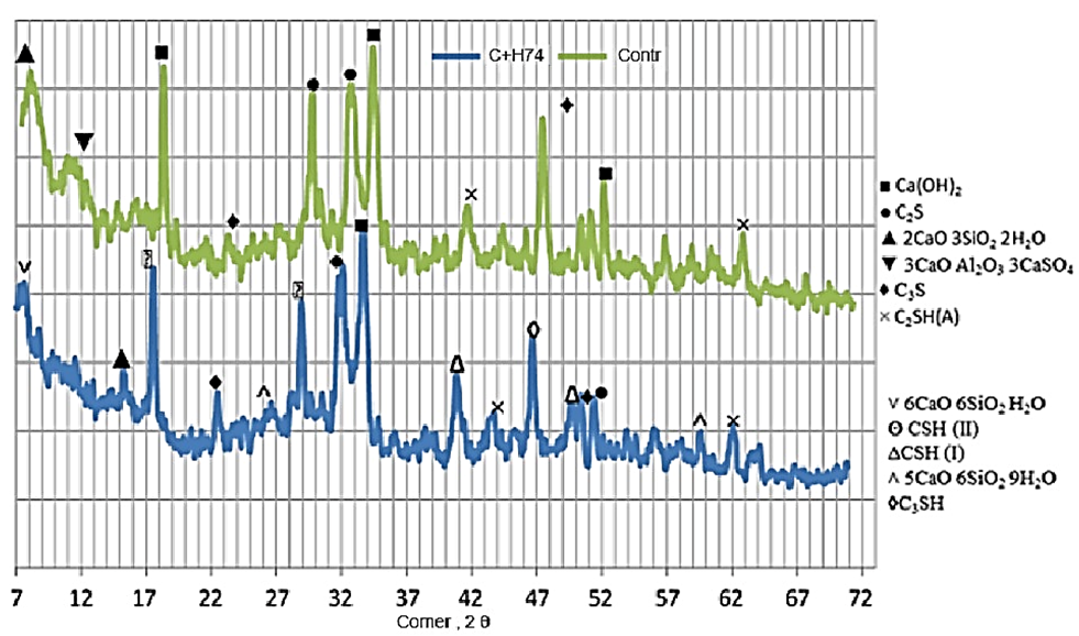 Thus, the use of a complex additive comprising a polyfunctional system (PA) and nanomodifier N74 increased the flexural and compressive strength of cement stone by 29% and 45%, respectively, as well as a reduction in the water demand of the mixture, which is associated with the hydrophobic-hydrophilic properties of the PA components. The achieved effect may be due not only to the modification of rheological characteristics, but also to the participation of the additive in the processes of cement stone structure formation. The pore space of the matrix is filled with growing calcium hydrosilicates, which form a compact structure and additional crystallization centers, which is consistent with the results presented in [25].