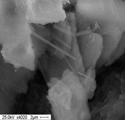 To verify the results obtained by electron microscopic analysis, Table 14 shows the quantitative oxide composition of the cement stone sample modified by the PD + H74 system at three points under investigation (001, 002, and 003; see Figure 5). Analysis of the data presented allows us to conclude that low-base calcium hydrosilicates belonging to tobermorite-like phases are predominantly formed in the pore space of cement stone (Figure 5). Points 002 and 003 are characterized by a CaO/SiO2 ratio < 1.5, which confirms the predominance of low-base calcium hydrosilicates in the composition of the formed phases.