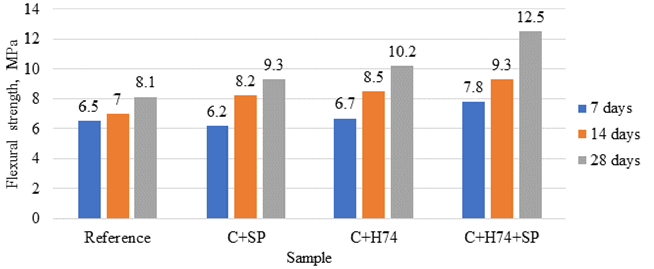 Additionally, Figure 6 shows the results of bending tests on modified cement stone, performed in comparison with the reference composition, which allows us to evaluate the contribution of the complex additive to the improvement of strength characteristics.
