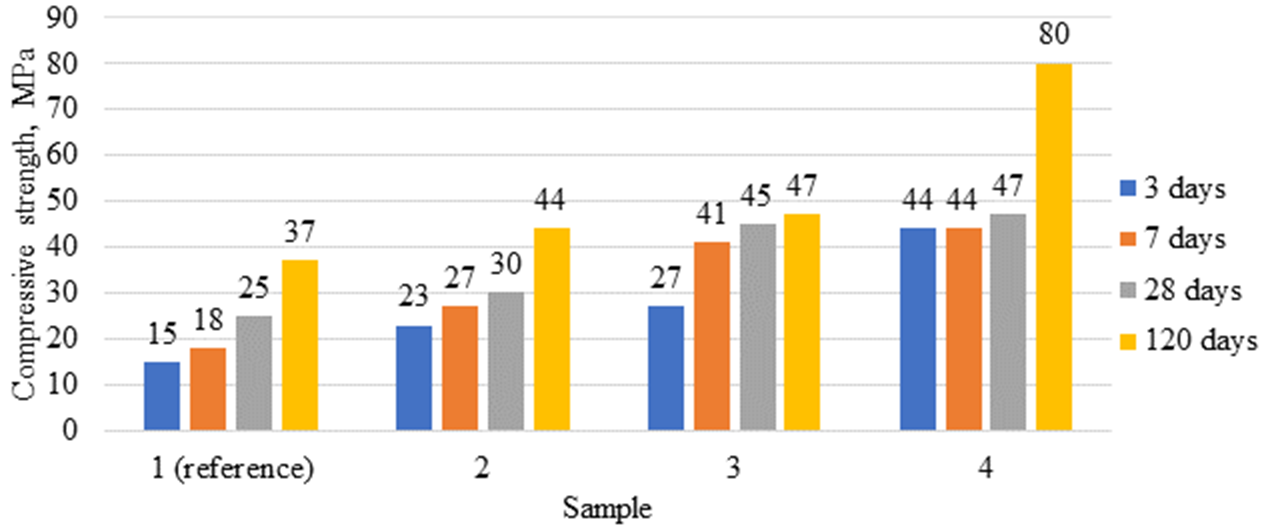 The strength characteristics of the concrete samples were determined at 3, 7, 28, and 120 days of hardening. Figure 7 shows the comparative results of strength gain over time for the tested compositions.
