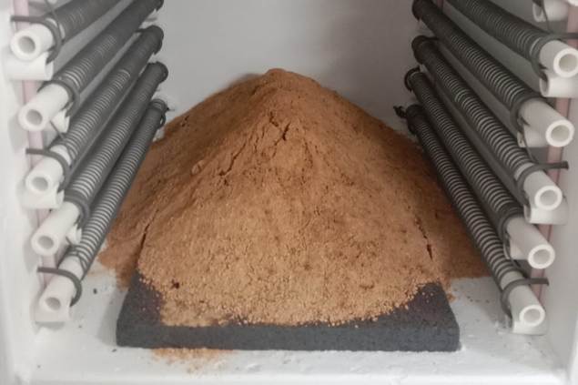 To determine the physical properties of the diatomite rock, cubic specimens (100 mm edge length) were prepared by sawing from diatomite pieces. The average density [15] was determined by weighing using ACS electronic scales (HUADE Ltd., Shanghai, China). Thermal conductivity [16] was measured using an ITP-MG-4 ZOND device (“Special Design Bureau Stroypribor” LLC, Chelyabinsk, Russia). For ceramic-technology studies, diatomite pieces were ground to obtain a fraction with particle sizes <2 mm (Figure 1) using an MShL-1 laboratory ball mill (NPK Mekhanobr-Technika, St. Petersburg, Russian Federation). To evaluate the effect of high-temperature treatment on diatomite properties, the <2 mm diatomite fraction was fired at 950 °C in an EKPS 50/1300 electric furnace (Smolensk SKTB SPU, Smolensk, Russia), producing calcined diatomite (i.e., thermolite).