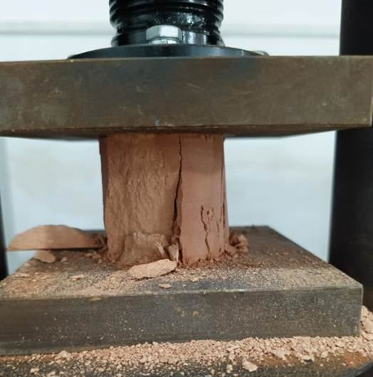 Silica-ceramic laboratory specimens were produced as Ø50 mm × 50 mm cylinders. For forming and testing operations, an LO-257 mold (RNPO RusPribor LLC, St. Petersburg, Russia) and a PGM-50MG4 press (SKB Stroipribor LLC, Chelyabinsk, Russia) were used (Figure 2). Two forming routes were used [17]: plastic molding and semi-dry molding. Specimens were produced from (i) 100% diatomite and (ii) a mixture of 90% diatomite + 10% loam (by mass). After shaping, specimens were dried in an SNOL 67/350 unit (Smolensk SKTB SPU, Smolensk, Russia) and then fired at 950 °C in an EKPS 50/1300 electric furnace.