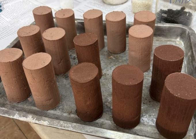 The prepared mixtures were molded into cylindrical samples with initial dimensions of 5×10 cm. After drying, the dimensions of the samples decreased to approximately 4.8×9.8 cm. Photographs of the dried samples are presented in Figure 2. The samples were dried in the drying machine SHS-80-01 SPU of the NV-LAB (Almaty, Kazakhstan) at 100 °C for 12 hours. The dried samples were fired in a laboratory muffle furnace SNOL 8.2 of the SNOL-TERM (Tver, Russia) at the selected sintering temperatures up to 1000 °C with a holding time of 1 hour, followed by furnace cooling.