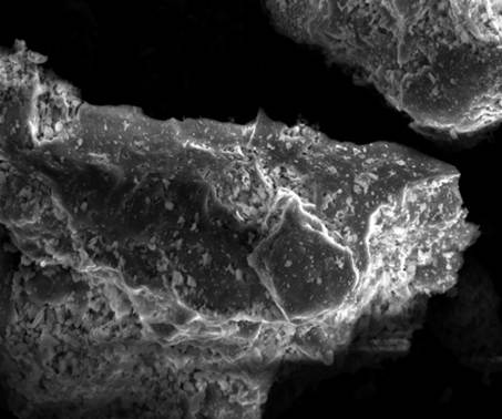 According to the image at 1000x magnification, particles measuring 20–30 µm in length have a layered, laminar structure with distinct edges and fracture planes characteristic of layered minerals such as kaolinite, montmorillonite, or illite. At 3500x magnification, particles measuring 0.2–1.5 µm with a scaly relief indicate the presence of montmorillonite. It was noticed in [24] too.
