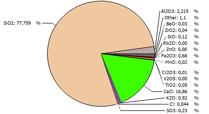 Silicon dioxide is the main component of glass waste [30]. A SiO2 content of 70-73% indicates the amorphous nature of the glass, which is capable of forming a stable silicate structure. Calcium oxide acts as a stabilizer for the glass structure. The total content of the remaining oxides does not exceed 3%, so they do not significantly affect the chemical balance of the material. However, they certainly contribute to the formation of a homogeneous microstructure [31].