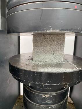 Compressive strength was determined in accordance with [9] using a hydraulic press (maximum capacity 1000 kN). Before testing, specimen surfaces were cleaned, and dimensions were measured. The load was applied at 0.5-0.8 MPa/s until failure. The compressive strength test setup is shown in Figure 1.