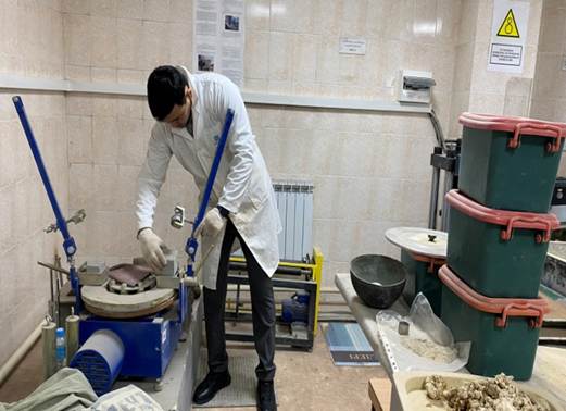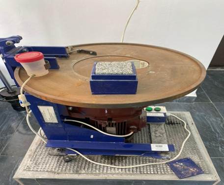 Abrasion resistance was measured on 70×70×40 mm specimens (Stage A) and, for the pilot study, by mass-change measurements using the IB-1 device. Abrasion testing was conducted in accordance with [10], using a rotating-disc abrasion configuration with quartz sand (0.5-1.0 mm) and an applied load of approximately 294 N (30 kgf). After testing, specimens were cleaned and dried at 105 ± 5 °C to constant mass. Abrasion was quantified by mass loss and, where required, converted to volumetric abrasion using specimen density. The abrasion test setup is shown in Figure 2.