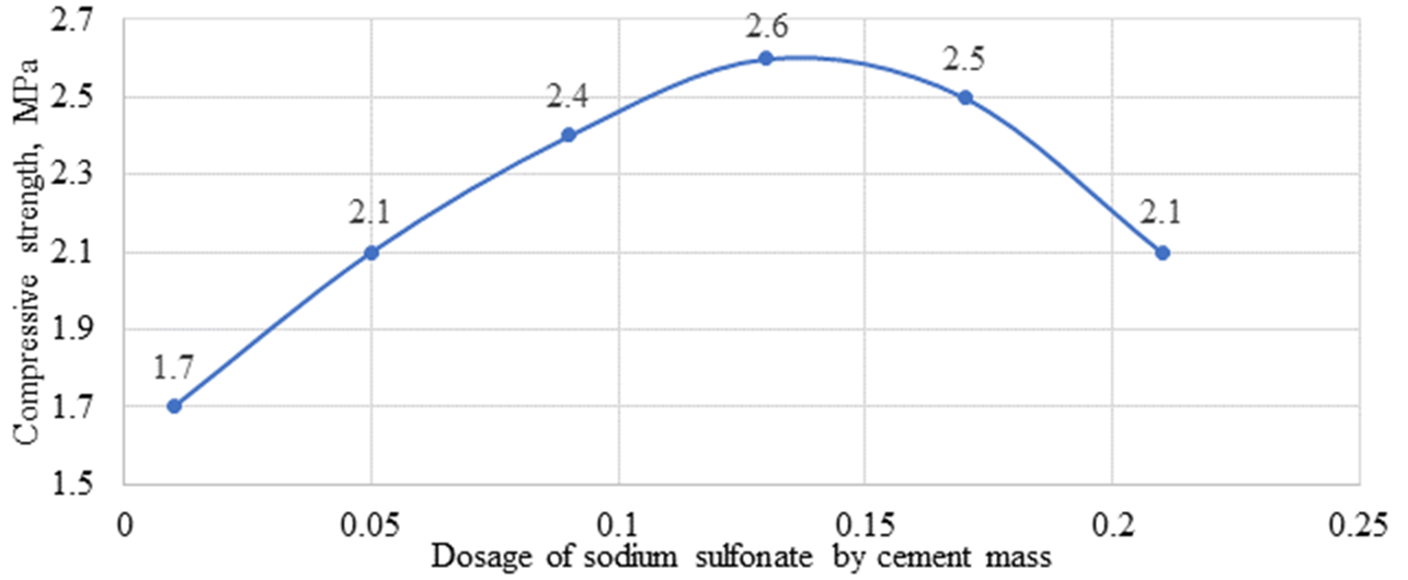 In the laboratory dosage series, the compressive strength increased with sodium sulfonate content up to an optimum range and then declined at higher dosages: the reference mixture (0.00%) reached 1.5-2.0 MPa at 28 days, while mixtures with 0.10-0.15% sodium sulfonate achieved 2.3-2.7 MPa; at 0.20% and above, the strength trend decreased and the structure was reported to deteriorate at >0.25%. The broader property trends attributed to sodium sulfonate indicate improved mixture plasticity and pore uniformity, reduced bulk density and thermal conductivity, and a slight increase in water absorption, which together reflect the additive’s role in stabilizing the porous structure and enhancing thermal efficiency.
