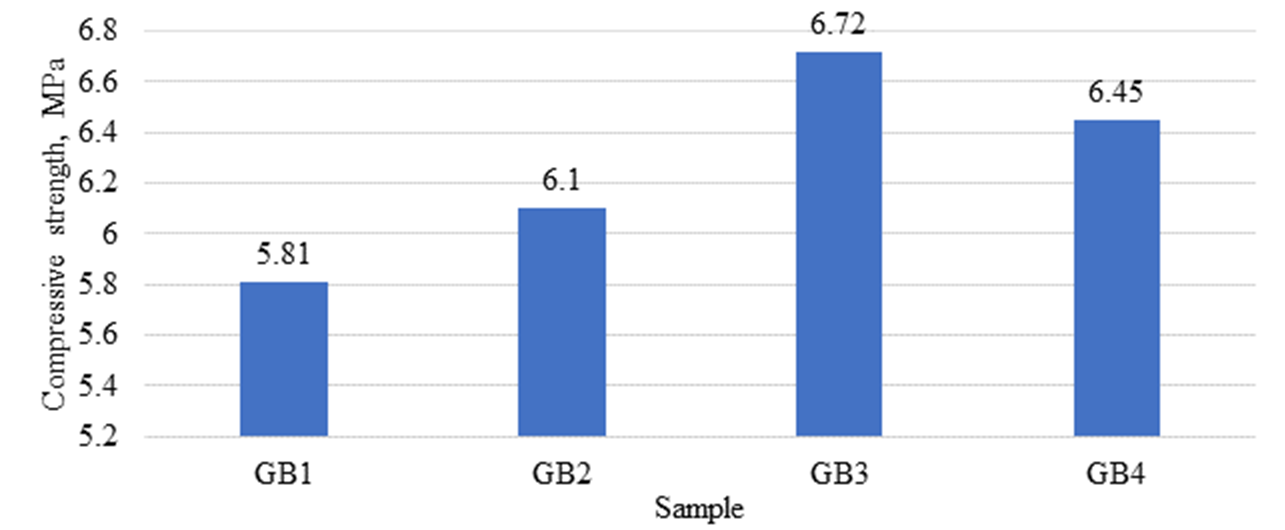 When compressive strength was reported for GB1-GB4 with reference to [9], the values were in the range of 5.81-6.72 MPa, with the maximum strength recorded for GB3 (6.72 MPa) (Figure 4).