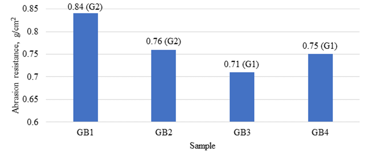 Abrasion resistance results (mass-loss method) indicate that sodium sulfonate improves wear resistance by reducing the abrasion value from 0.84 g/cm² (GB1, grade G2) to as low as 0.71 g/cm² (GB3, grade G1) (Figure 5).