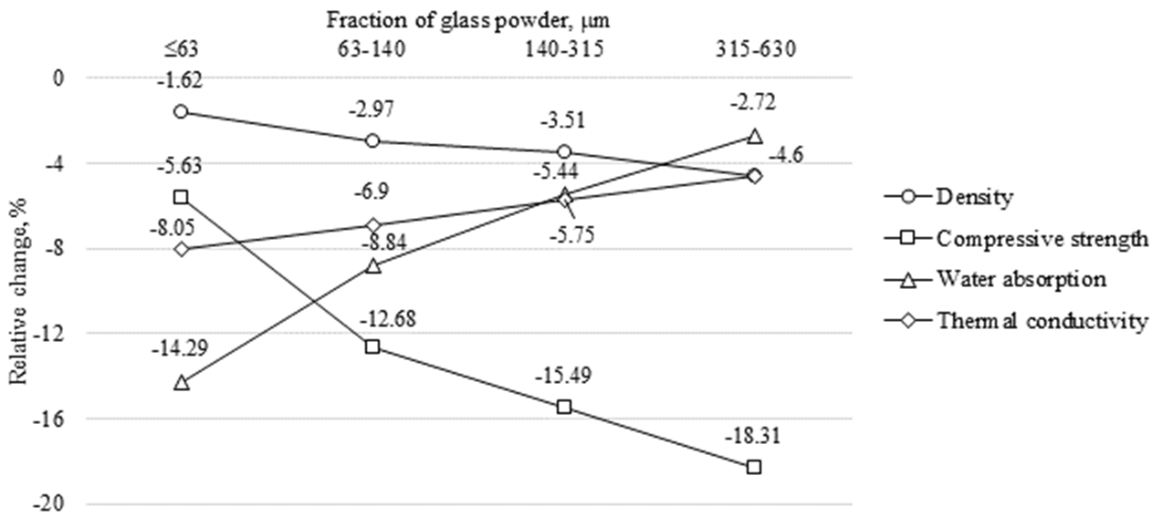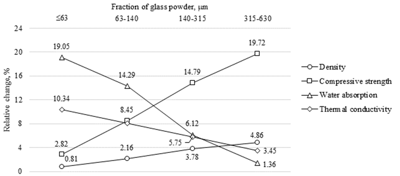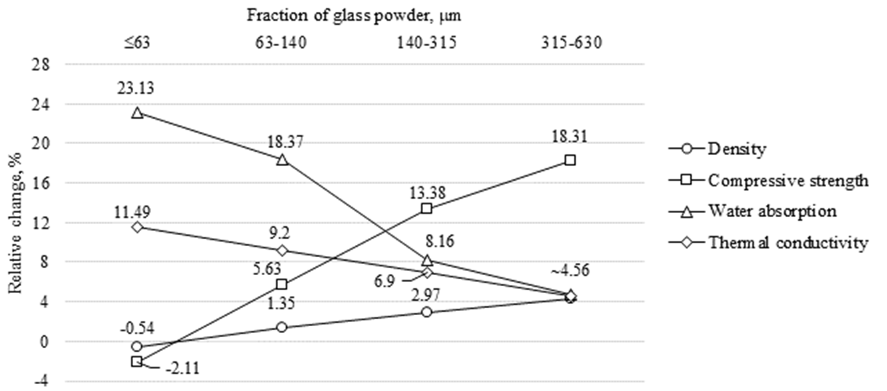For the 140-315 μm fraction, Table 1 shows only limited variation with glass content: density remains within 1780-1795 kg/m3, compressive strength within 12.0-12.3 MPa, water absorption within 13.5-13.9%, and thermal conductivity within 0.81-0.82 W/(m·°C). Figure 4 likewise shows that all relative changes remain modest and compressive strength stays below the reference level at all dosages. Thus, this fraction has only a weak modifying effect. The limited modification effect observed here is also comparable to the pore-structure study of [7], where the performance of autoclaved glass-modified materials was closely linked to how effectively the additive altered the porous structure.
