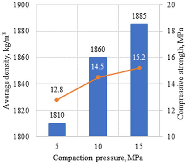 The variation of compaction pressure for the optimal composition showed that increasing pressure from 5 to 15 MPa led to an increase in density from 1810 to 1885 kg/m3 and compressive strength from 12.8 to 15.2 MPa, while water absorption decreased from 12.4 to 11.0%. At the same time, thermal conductivity remained within a narrow range of 0.77-0.79 W/(m·°C), indicating that compaction pressure had a stronger effect on physical-mechanical properties than on thermophysical behavior.